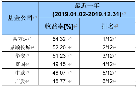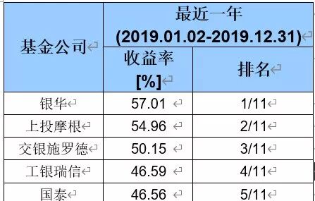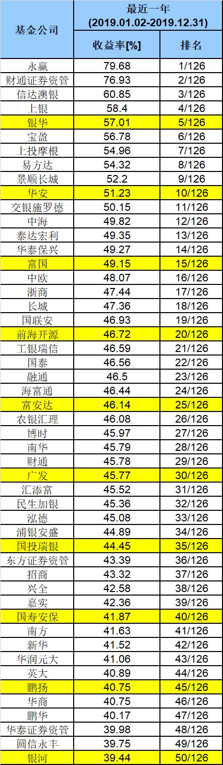 此外,宝盈、上投摩根、易方达、景顺长城、华安位列第六至第十,收益率在51%~58%之间。