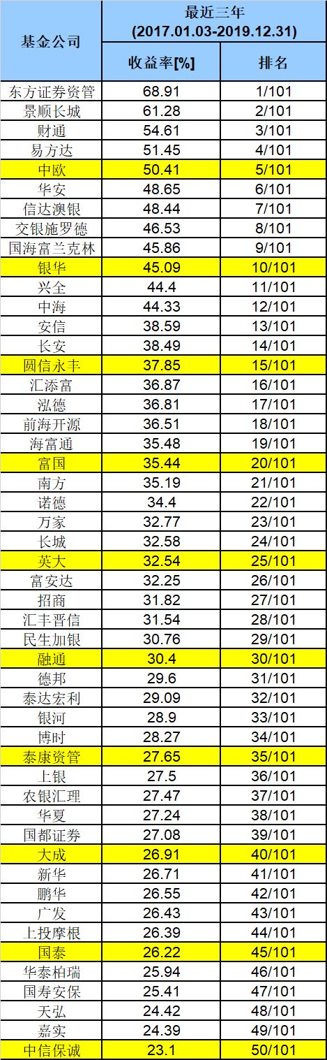 从3年期(2017年1月3日到2019年12月31日)绝对收益排名看,东方资管旗下权益类基金平均收益率达到68.91%,在101家公司中排名第一;景顺长城基金、财通基金、易方达、中欧基金旗下权益类基金平均收益率分别为61.28%、54.61%、51.45%、50.41%,排名第二至第五。